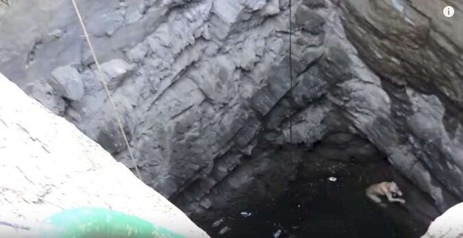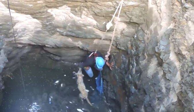 Der Hund klammerte sich mit letzter Kraft an die Felsen am Rande des Brunnens. Er sah sehr erschöpft aus und seine Pfoten waren blutverschmiert vom Klettern. Er hätte wahrscheinlich nicht viel länger überlebt, wenn nicht eine Handvoll Helden gekommen wäre, um ihn zu retten.