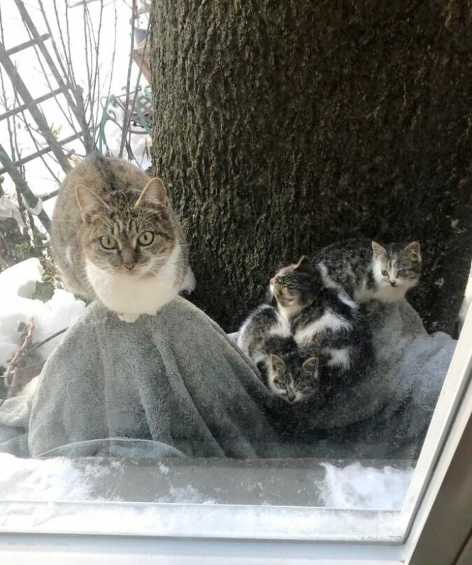 Rene Bessera schaute frühmorgens aus dem Fenster und sah eine frierende Katze und Kätzchen. Das Mädchen näherte sich ihnen nicht, sie wollte sie nicht verscheuchen. Die Katze war sehr wachsam und ließ niemanden an sich heran.