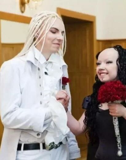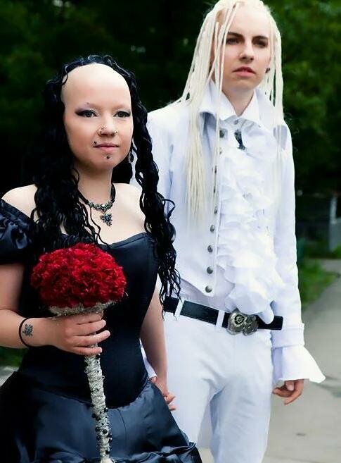 Die Braut wählte ein schwarzes Kleid und rasierte sich auch einen Teil ihrer Haare im Stirnbereich ab. Ohrringe und Tattoos vervollständigten das Bild der Gothic-Liebhaber. Sie haben die Hochzeit während des Konzerts abgehalten.