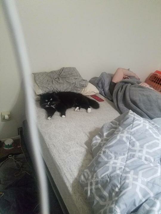 Foto 6: Die Katze scheint ihren Besitzer an den Rand des Bettes getrieben zu haben.