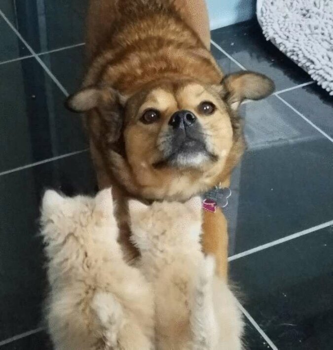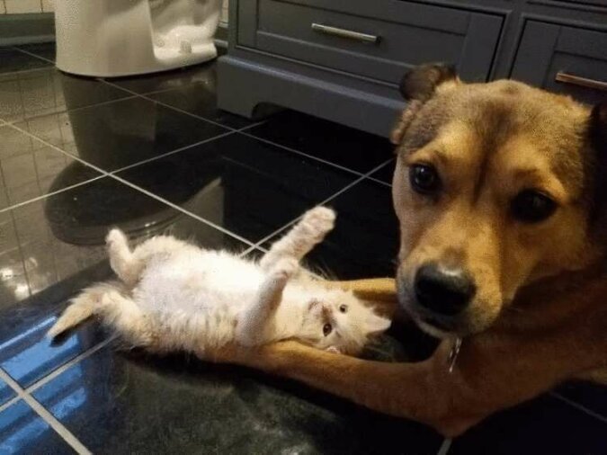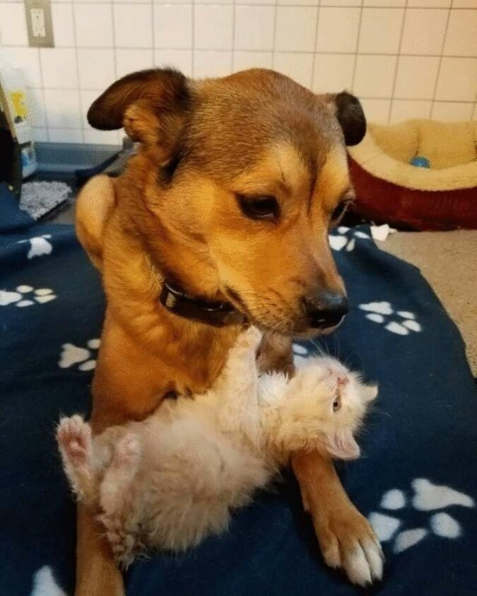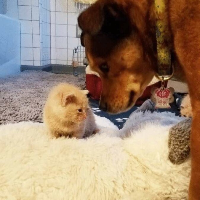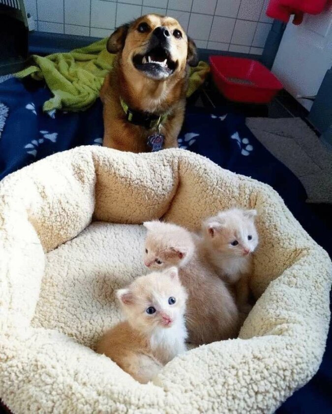 Turbo untersuchte die Kätzchen zunächst sorgfältig und begann dann, sie zu lecken und zu wärmen. Der Hund ließ die Kätzchen eine Minute lang nicht aus den Augen, und dann schliefen sie gemeinsam ein.