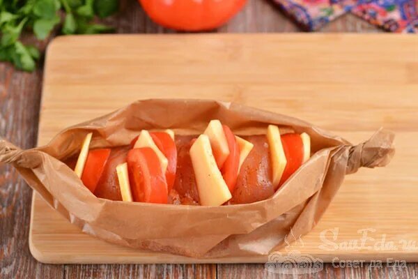 Nach dieser Methode kann ein Hähnchenbrustfilet mit Champignons, Zucchini, Zwiebeln, Spinat, Pflaumen, Aprikosen, Pfirsichen oder Ananas gegart werden, und anstelle von Hartkäse kann man Sahne oder geschmolzenen Käse, Sulguni oder Mozzarella hinzufügen. Ein Hähnchenfilet mit beliebiger Füllung wird saftig, aromatisch und sehr schmackhaft. Heute werde ich das Filet mit Hartkäse und Tomaten zubereiten. Damit die Brust möglichst saftig wird, brate ich sie im Ofen auf Backpapier, das durch Alufolie ersetzt werden kann. Das Gericht sieht wunderschön und originell aus.