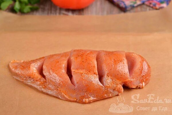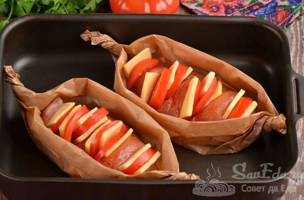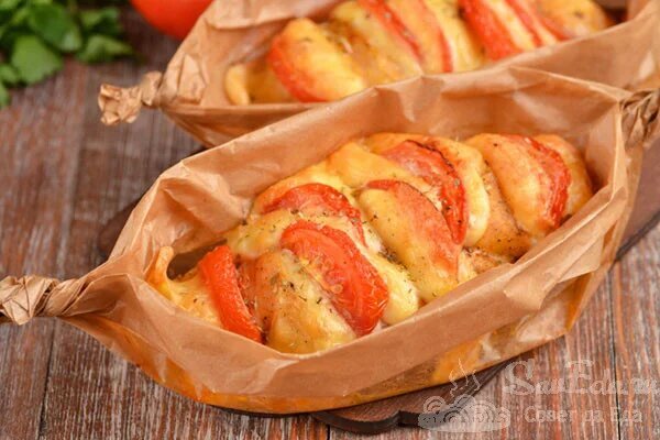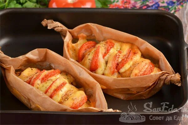 Die Hähnchenfilets in Backpapier auf Tellern ausbreiten (Sie können das Papier weglassen) und sofort servieren. Dieses Filet kann mit einer Vorspeise oder mit einem Gemüsesalat und knusprigem Brot serviert werden. Wenn sie auf dem Papier gebacken werden, wird das Gericht sehr saftig, aromatisch und äußerst schmackhaft.