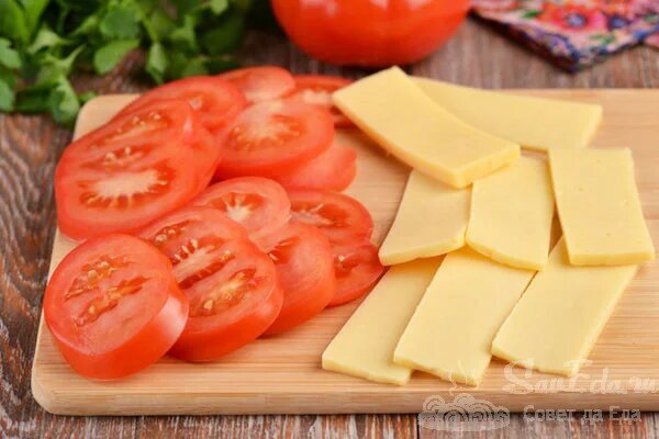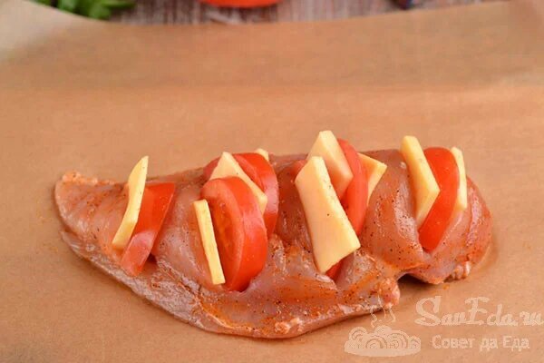 Die Käse- und Tomatenscheiben in 2-3 Stücke schneiden. In jeden Einschnitt 1-2 Scheiben legen. Sie ragen aus den Einschnitten am Filet heraus. Nach dem Backen schmilzt der Käse, die Tomaten werden weich und alles wird gleichmäßig.