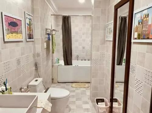 Die Toilette und das Badezimmer sind miteinander verbunden. Sie entschieden sich, diesen Raum in sanften weißen Farben zu dekorieren. Die Renovierung wurde nach modernen Standards durchgeführt. Bei einer so großen Familie kann die Kombination von Toilette und Badezimmer jedoch einige Unannehmlichkeiten mit sich bringen. Wenn zum Beispiel ein Familienmitglied duscht, muss ein anderes vielleicht auf die Toilette gehen.