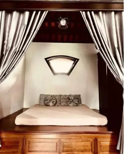 Für das Schlafzimmer und das Wohnzimmer wurde ein orientalischer Stil gewählt, bei dem die Vorhänge eine trennende Rolle spielen. Das Wohnzimmer dient auch als Essbereich für das Mittag- oder Abendessen.