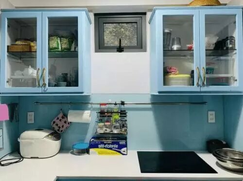 Als nächstes sehen wir die Küche, die alles hat, was man zum Arbeiten braucht. Die Küchenschränke sind blau gestrichen und die Türen sind aus Glas. Alles sieht sehr harmonisch aus.