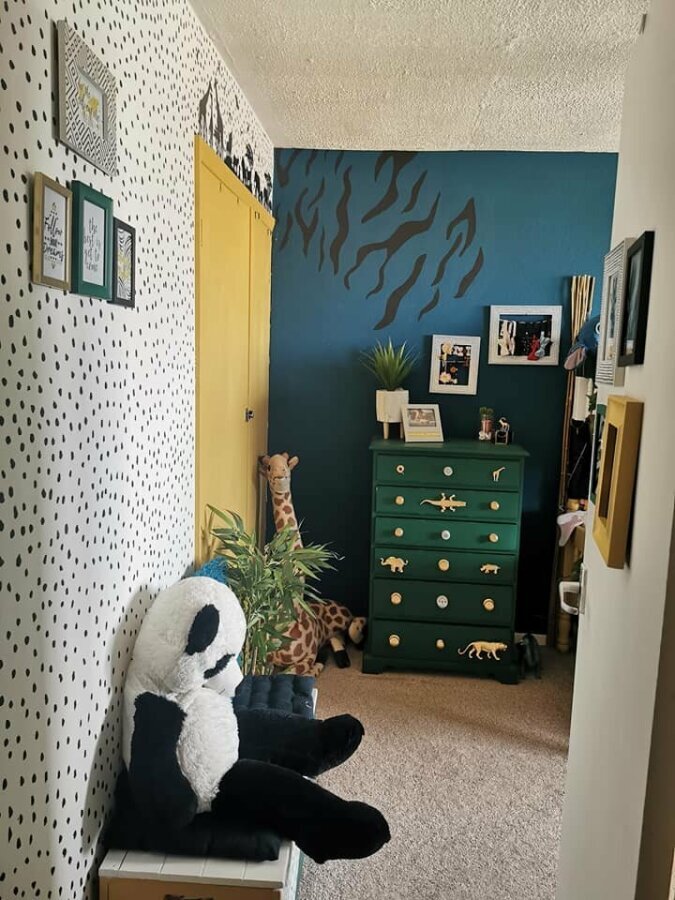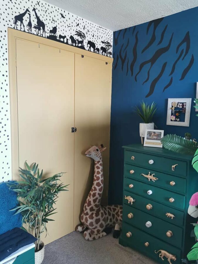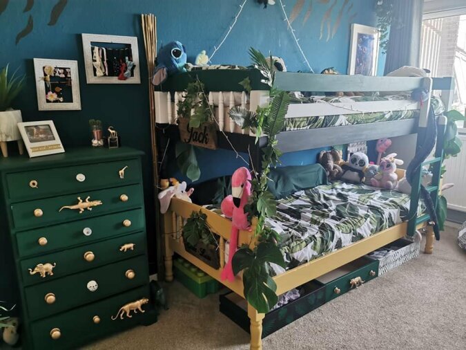 "Meine Kinder wollten ein Zimmer im Dschungelstil, also habe ich mit einem Schubladenset begonnen, das ich vor einigen Jahren von einem Kunden geschenkt bekommen hatte. Ich habe sie grün gestrichen und mit goldenen Griffen versehen", erklärt Becky.