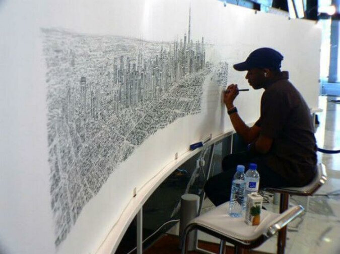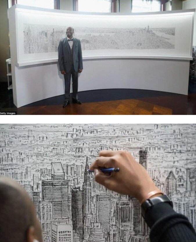 Der britische Künstler Stephen Wiltshire ist bekannt für seine Fähigkeit, eine Landschaft, die er nur einmal gesehen hat, aus dem Gedächtnis genau wiederzugeben. Er flog 45 Minuten lang in einem Hubschrauber über New York und verbrachte dann fünf Tage damit, ein genaues Panorama von Manhattan zu zeichnen.