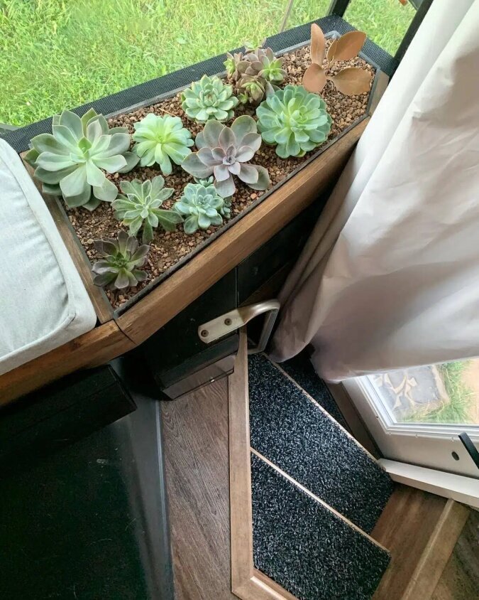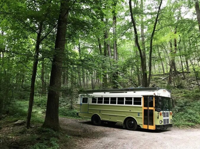 Um der Natur näher zu kommen, verwendete das Paar grüne und braune Farben für den Anstrich des Busses. Außerdem installierte das Paar Sonnenkollektoren auf dem Dach, um umweltfreundliche Sonnenenergie zu nutzen.