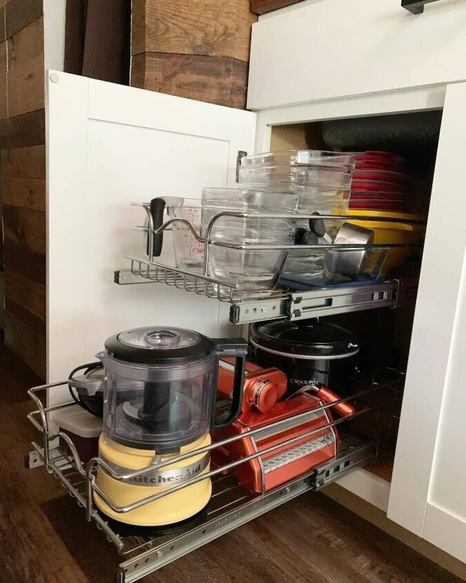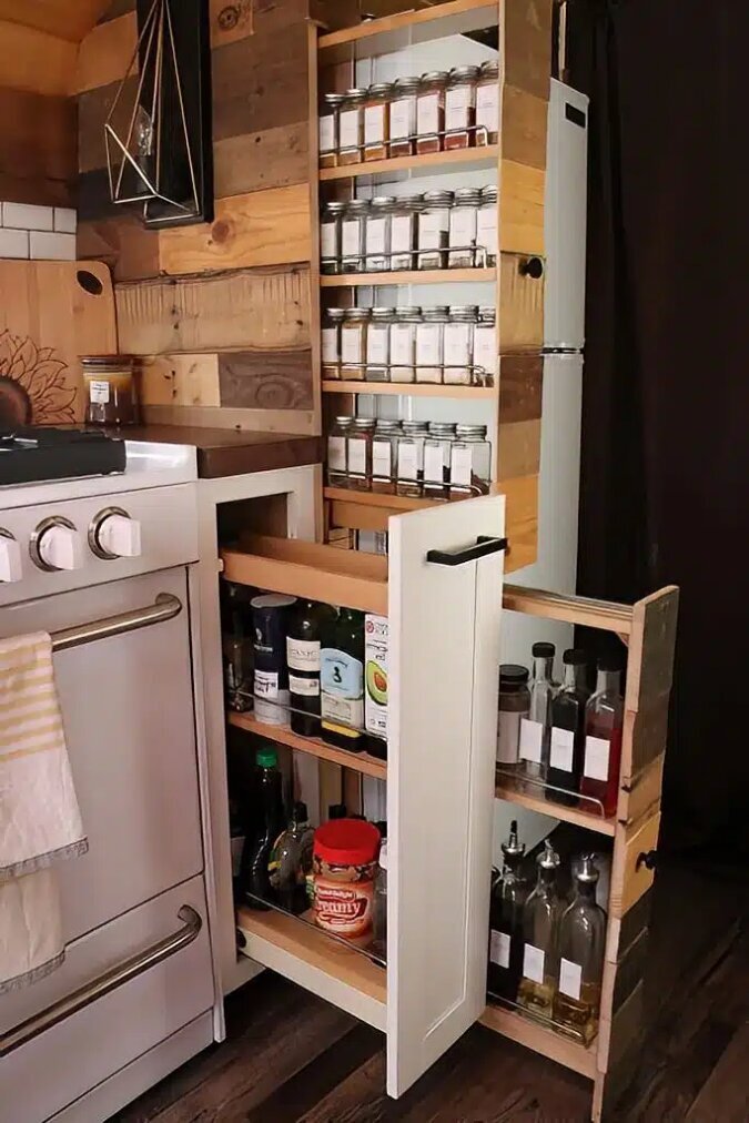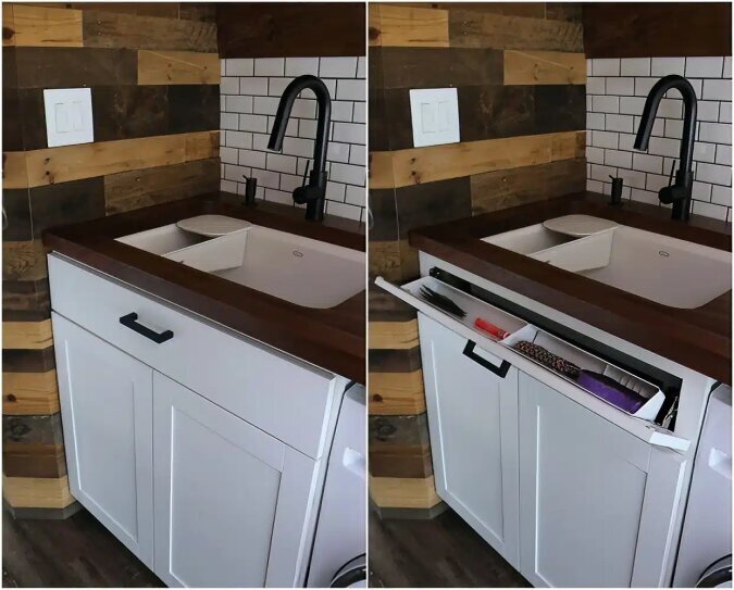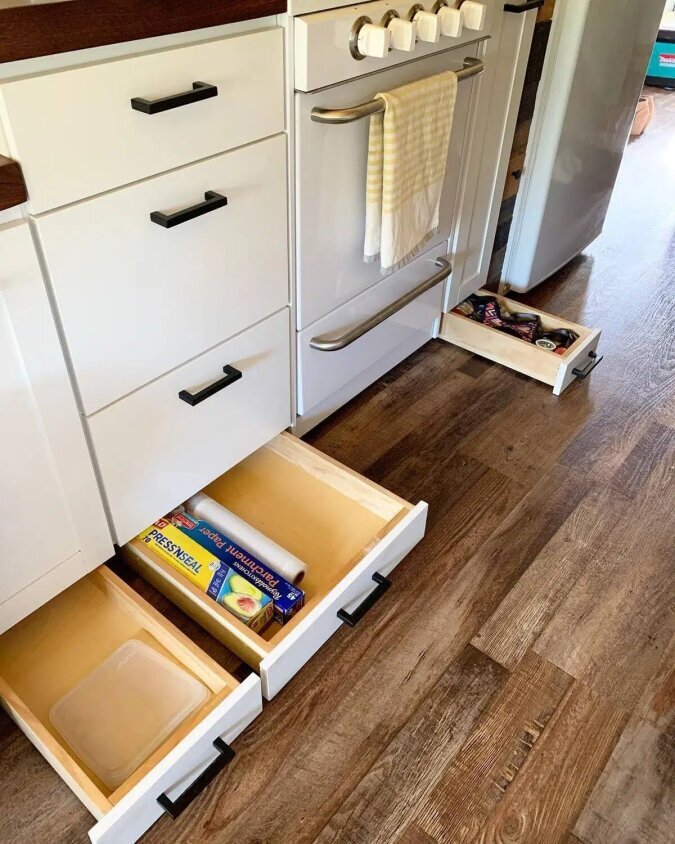 Das Ehepaar hat auch den Platz unter den Schränken geschickt genutzt und sie mit mehreren großen ausziehbaren Schubladen ausgestattet.