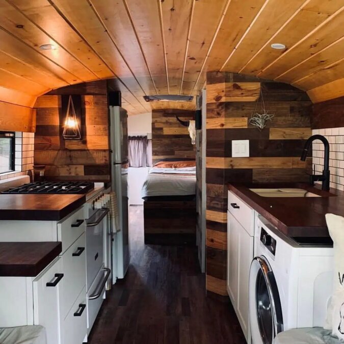 Holly und Dustin haben es sogar geschafft, ein Kochfeld, einen Backofen, ein Waffeleisen und einen Dampfgarer in der Küche unterzubringen. Die Wände in der Küche sind aus Holzpaletten und die Arbeitsplatten aus massivem Nussbaumholz gefertigt.