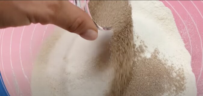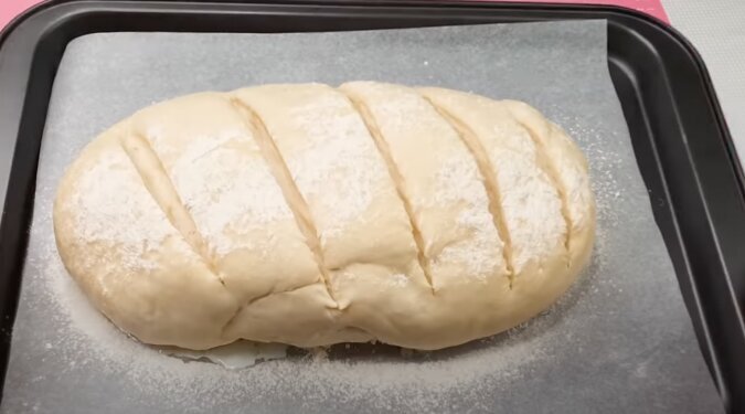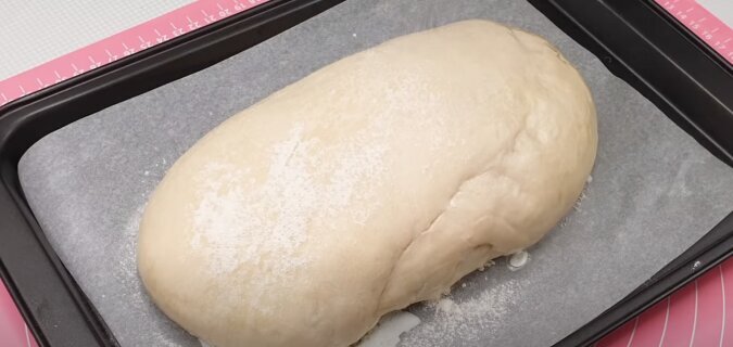 Wenn der Teig aufgegangen ist, bestäuben Sie ihn mit Mehl.