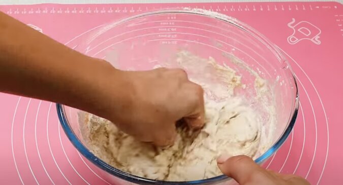 Den Teig gut durchkneten. Es ist sehr wichtig, dass Sie dies mit Ihren Händen tun.