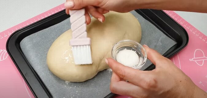 Etwas Pflanzenöl mit der Milch verrühren und den Teig damit bestreichen.