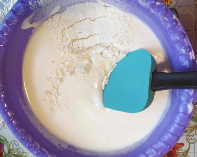 Dann das gesiebte Mehl portionsweise 3-4 Mal mit einem Spachtel unterheben. Kurz und behutsam mit einer Greifbewegung mischen. Der Teig sollte dick und weich sein, ähnlich wie ein Marshmallow.