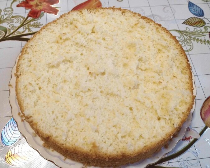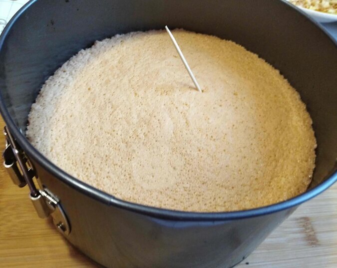Mit einem Zahnstocher prüfen, ob der Biskuit fertig ist. Lassen Sie den Biskuit vollständig abkühlen und lösen Sie ihn dann aus der Form. Es ist wünschenswert, den Biskuit nicht früher als nach 5-6 Stunden zu schneiden. Deshalb koche ich den Biskuit immer am Tag vor dem Fest. Sie ist sehr praktisch, man muss sie nur noch einfetten, und schon ist der Kuchen fertig.