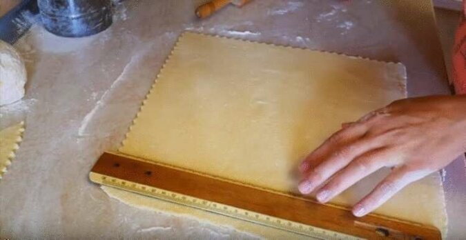 2. Den Teig ausrollen. Schneiden Sie die Ränder so ab, dass ein Quadrat entsteht. Sie können ein Kochlineal verwenden.