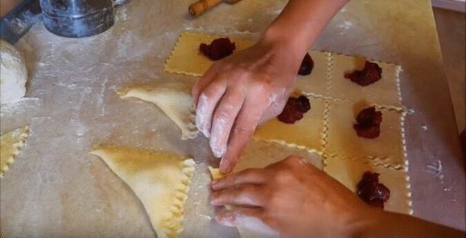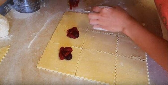 3. Teilen Sie das Quadrat in 9 gleiche Teile. Legen Sie dann jeweils eine Füllung darauf. Nehmen Sie zum Beispiel Kirschmarmelade.